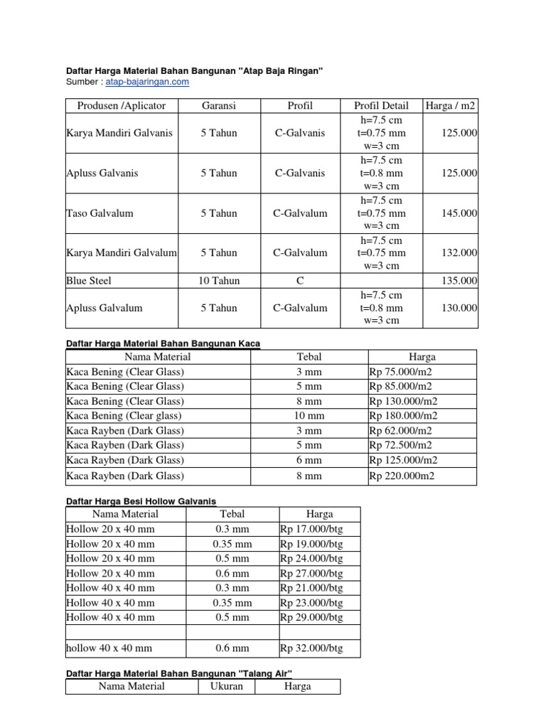 Untuk proyek bangunan tinggi (high rise building) material alam seperti pasir, batu, split dan semen, sudah banyak digantikan dengan beton readymix, beton. Harga material alam (batu, pasir, sirtu, dll) oleh pt. Railing tangga railing atau pegangan tangga adalah elemen tangga yang cukup penting keberadaannya. Daftar harga borongan bangunan yang kami sampaikan di atas hanya sebatas tenaganya saja. Selamat menyimak dan pastikan membacanya dengan teliti. Dalam menghitung rencana anggaran biaya bangunan (rab) kita memerlukan data harga material atau bahan bangunan sebagai dasar perhitungan. Contohnya, harga bangunan pada tahun 2012 berbeda dengan harga bangunan tahun 2013. Material alam langsung adalah bahan bangunan yang banyak digunakan untuk proyek rumah tinggal, perumahan, bangunan air, pekerjaan perkerasan jalan dan sebagainya. 3, standar biaya bahan/material bangunan. Untuk mempermudah kamu, rumah123.com merangkum daftar harga material bangunan terbaru 2021 di wilayah jabodetabek. 4.4, daftar standar harga satuan. Berikut harga standar dari sejumlah bahan bangunan yang paling sering digunakan dalam pembangunan: Kecil 3000 x 1050 x 4 mm lb 60,000 2400 x 1050 x 4 mm lb 48,000 2100 x.